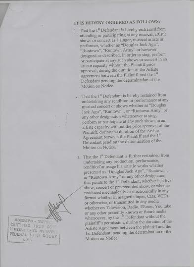 A Federal High Court sitting in Lagos has slammed an injunction against the rising musical artiste Douglas Jack-Agu aka "Runtown". The injunction prevents him from performing at any event or any form of recording for the time being unless with the approval of Ericmany Limited. Runtown is signed under the Ericmany Entertainment label that presently holds the copyright to all his music.He was sued in the Federal High Court by Ericmany on allegations that he signs up, concludes and attends musical shows without the knowledge of the label. Ericmany Entertainment was said to have invested millions of naira on Runtown.